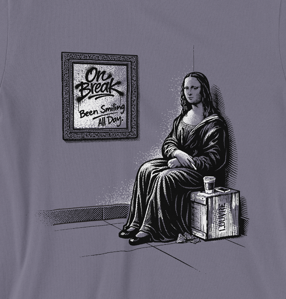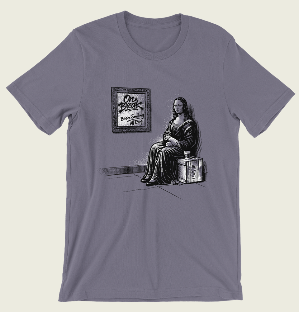 • Unisex T-Shirt Tired of the same old masterpiece? Meet our Mona Lisa on Break tee where the world's most famous smile finally gets a day off. This unisex tee flips the script on Renaissance art with a cheeky twist: the Mona Lisa caught in a candid moment of pure relaxation.